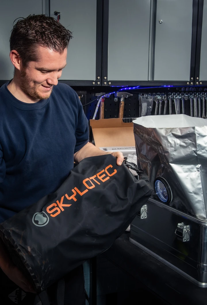 Een geautoriseerde inspecteur plaats het product in een speciale luchtdichte en UV resistente zak met vochtindicator. Inclusief bijbehorende onderdelen. Daarna wordt de zak vacuüm gezogen en dicht geseald via verwarming van de sealstrip. De zak gaat vervolgens in een aluminium kist of in een drybag. Afhankelijk van de situatie.
