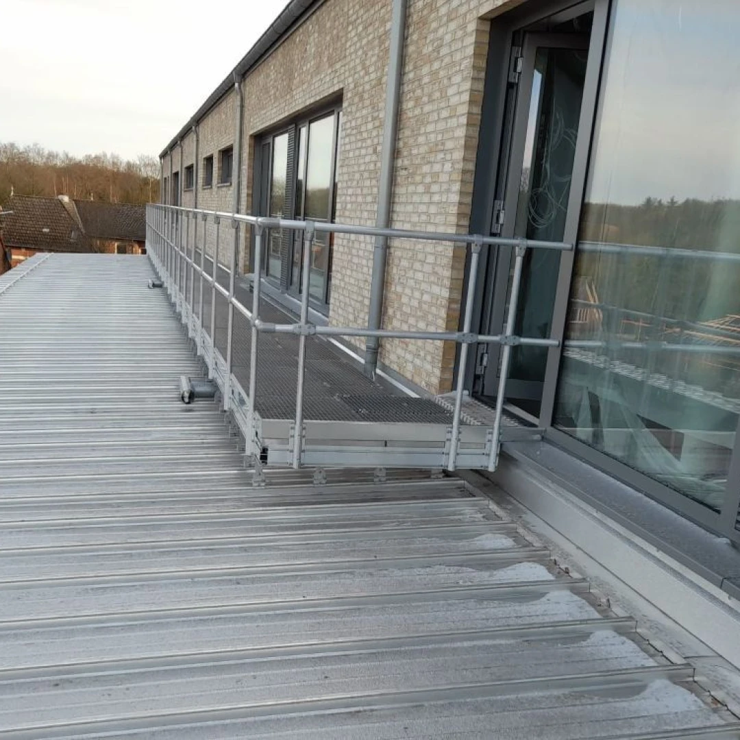 Kalzip Dachwege bieten Sicherheit für das Warten von Dächern und der installierten Anlagen. Das System ist erhältlich in den Breiten von 500 mm oder 800 mm. Der Einsatz des Systems dient als Wartungsweg nach EN 516 und DIN 4426. Gitterroste mit Rutschhemmung R11. Inklusive Neigungsverstellung zur Anpassung der Dachneigung und den bauaufsichtlich zugelassenen Befestigungsklemmen (Z-14.4-560) für durchdringungsfreie Befestigung auf Kalzip Profiltafeln. Das System kann mit oder ohne Geländer geliefert werden.