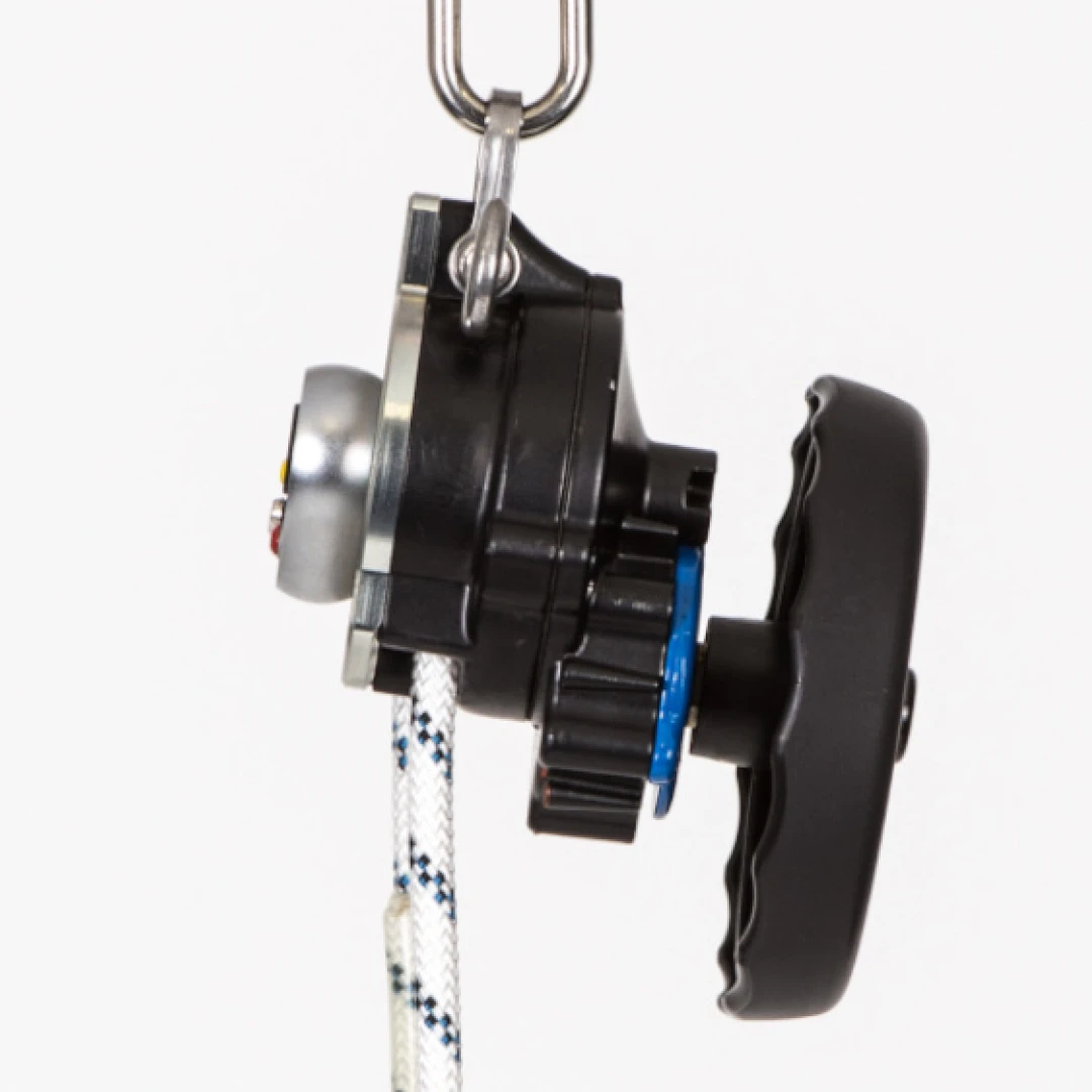 Das MRG9 Easy ist ein sehr kleines und kompaktes Abseil- und Rettungsgerät mit Handrad. Mit der Hubfunktion lässt sich eine verunfallte Person anheben, um sie aus der Sicherung zu befreien und anschließend sicher abzuseilen.