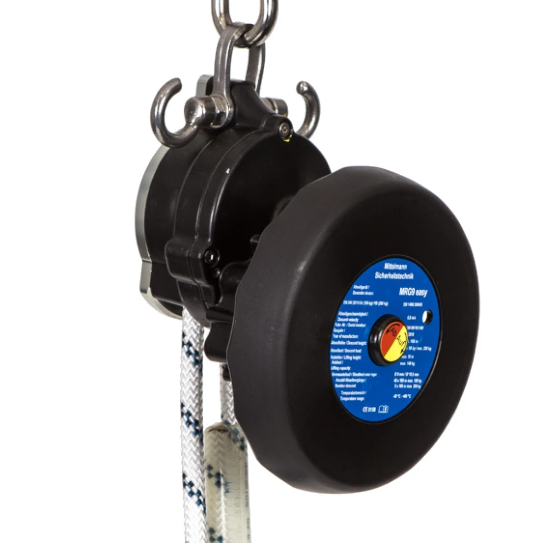Das MRG9 easy von Mittelmann ist für bis zu 2 Personen mit einem Gesamtgewicht von bis zu 200 kg ausgelegt. Die Abseilgeschwindigkeit beträgt ca. 1 m/s. Die maximale Abseilhöhe beträgt 160 m und die maximale Hubhöhe 30 m.