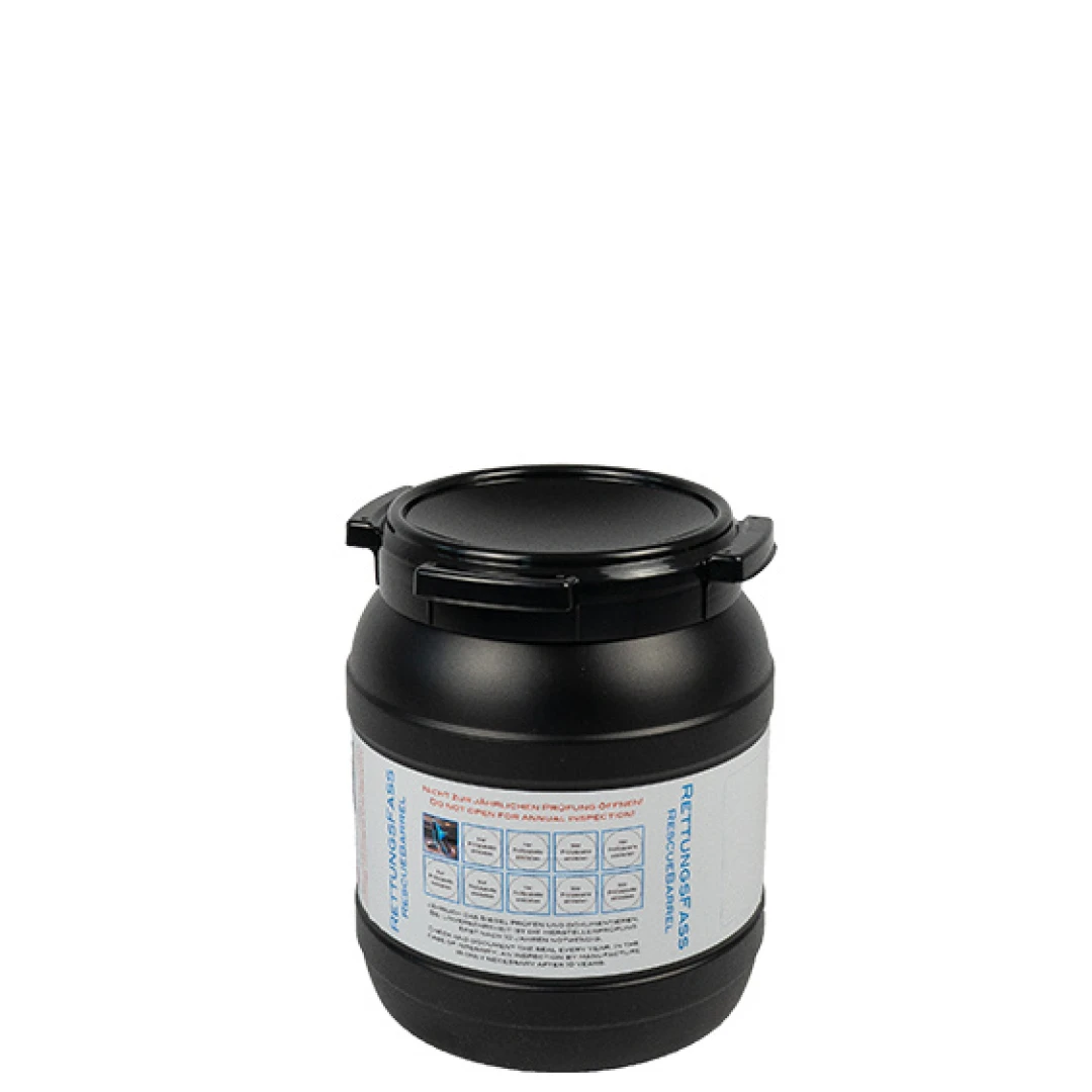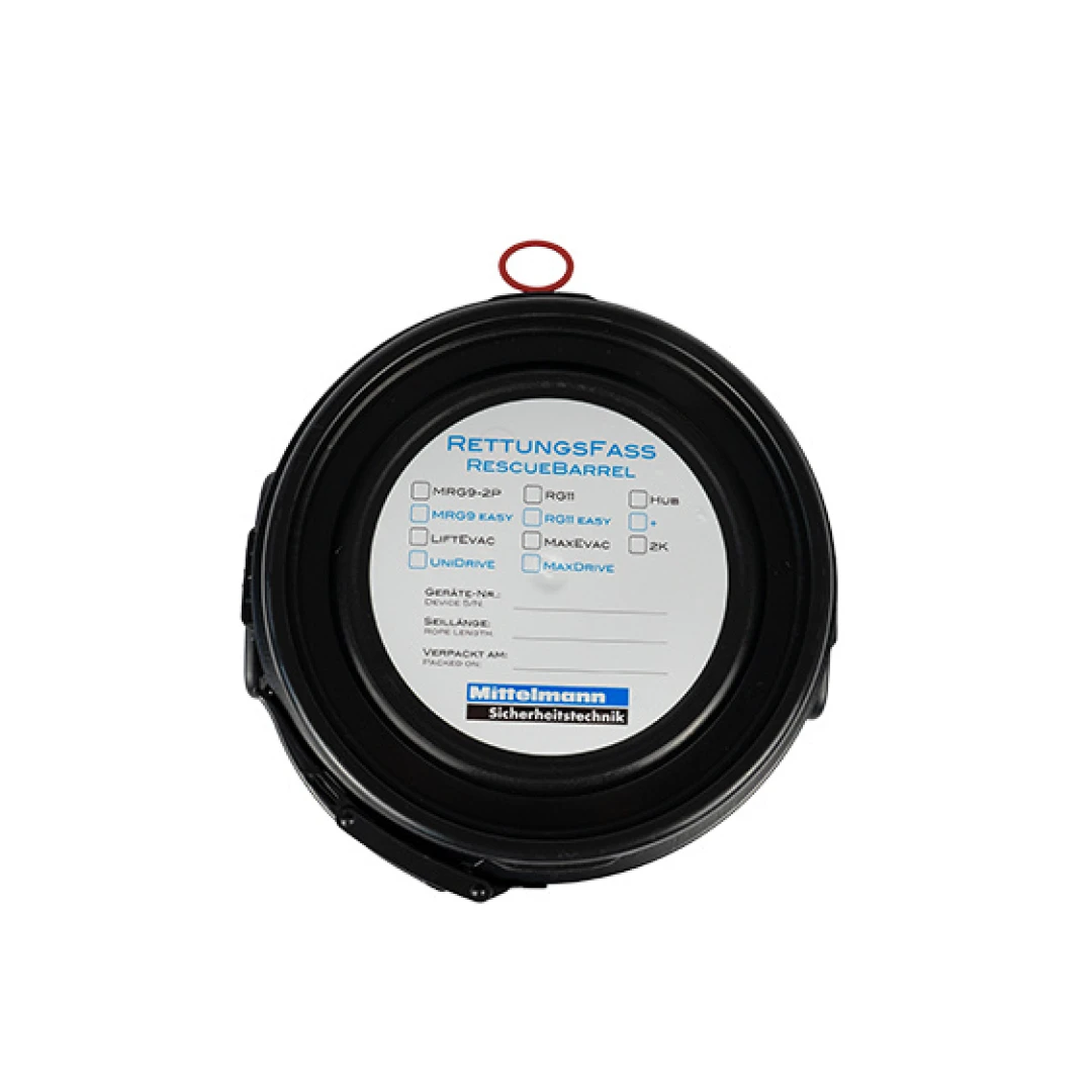 Das MRG9 easy ist auch in einem wasser- und lichtdichtem Rettungsfass erhältlich. So kann die Ausrüstung bis zu 10 Jahre geschützt und wartungsfrei aufbewahrt werden.