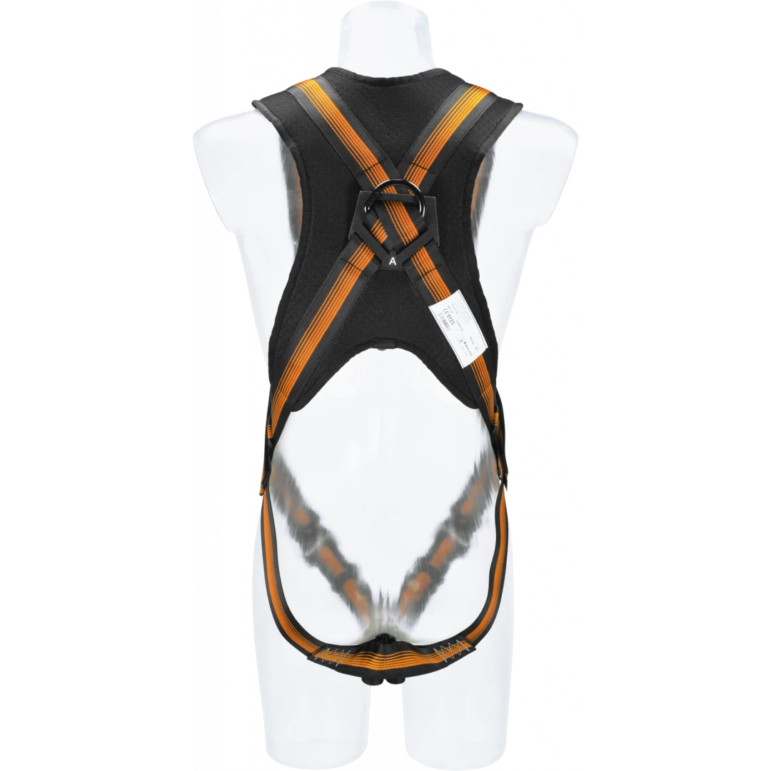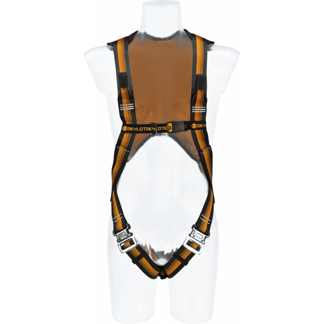Der Skylotec CS2 Click X-Pad hat Befestigungspunkte auf der Brust und auf der Rückseite. Auf der Brust hat er zwei textile Schlaufen auf der Rückseite ein D-Ring aus Stahl.