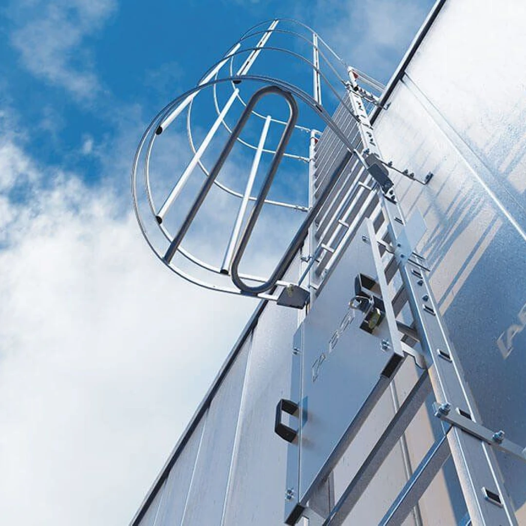 Ortsfeste Steigleitern sorgen für einen sicheren Zugang zu hochgelegenen Arbeitsplätzen an Gebäuden oder Maschinen. Bei Höhenunterschieden von mehr als 3m werden ortsfeste Steigleitern mit Rückenschutzkörben als Absturzsicherung ausgeführt. Ebenso können mehrere Züge oder Ruhepodeste verbaut werden und an nahezu jeder Art an Fassade befestigt werden.