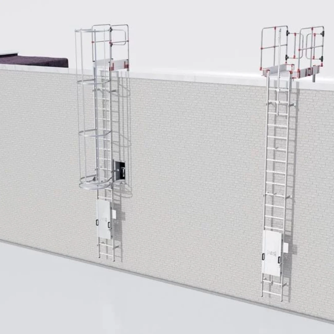 Die Käfigleiter ist eine Aluminiumleiter mit einer Breite von 650mm. Standardmäßig beginnt der Käfig bei 2,5 Metern (kann zwischen 2,2 und 3 Metern liegen). Dieser Käfig hat eine Tiefe von 800 mm, so dass er frei im Käfig klettern kann. Die Käfigleiter ist fest an der Fassade mittels Wandkonsolen befestigt oder mittels Betonblöcken frei aufgelegt.